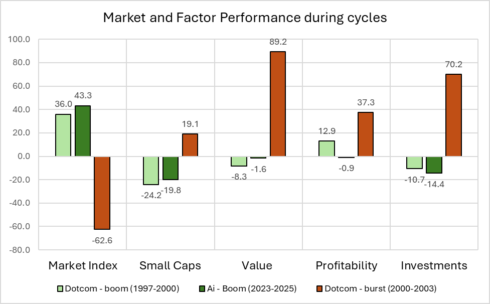 The graph shows how the market (long-only) and several long–short factors behaved during speculative phases of the market: the dot-com boom, the AI boom and the dot-com bust. The “Small Caps” factor, for example, is constructed by shorting the largest 30% of global equities and using the proceeds to buy the smallest 30%. An underperformance of this factor therefore indicates that large caps are outperforming small caps. The same long–short logic applies to the other qualitative factors displayed.