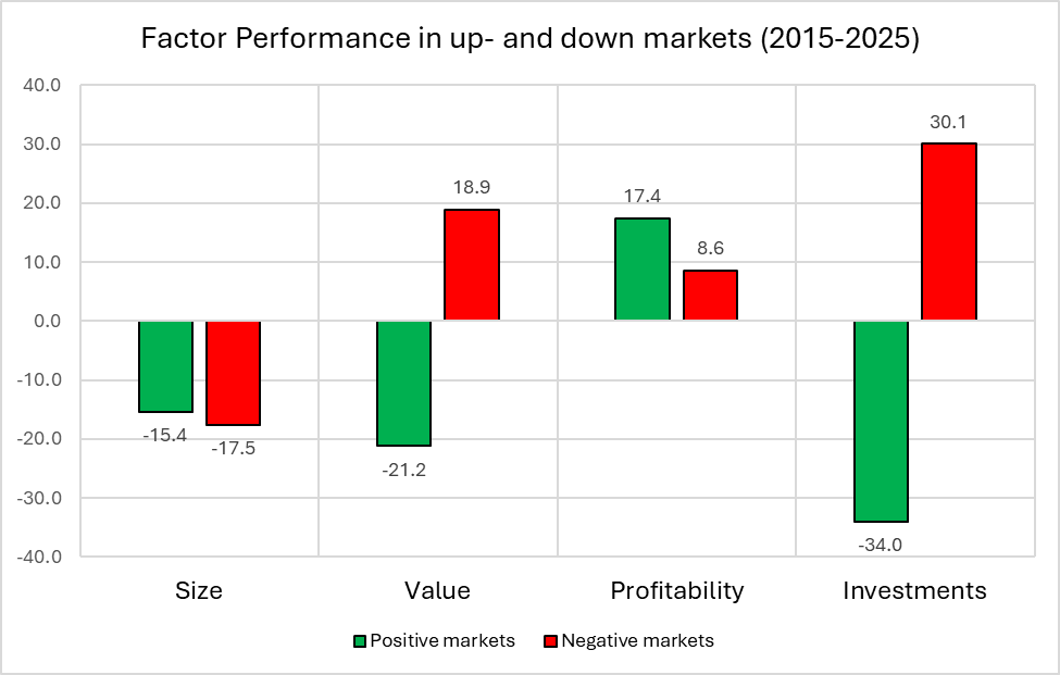 The graph shows how several long–short factors have behaved in up- and down-market environments. Value and low-investment stocks tend to outperform growth and high-capex stocks during weaker markets, while the opposite is generally true in rising markets. Some factors, such as profitability, have delivered positive results across both regimes, whereas others — most notably size — have struggled consistently, with mega caps outperforming small caps regardless of overall market direction.