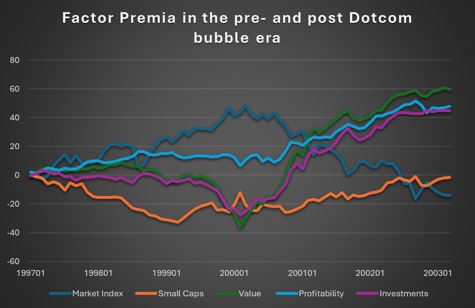 The graph above shows the cumulative performance of the market net of the risk-free rate (long-only), alongside the returns of the four long–short portfolios used in the Fama–French five-factor model. While it is clear that most quantitative factors struggled during the dot-com boom, it is equally evident that they benefited significantly from the subsequent market rotation once the bubble unwound.